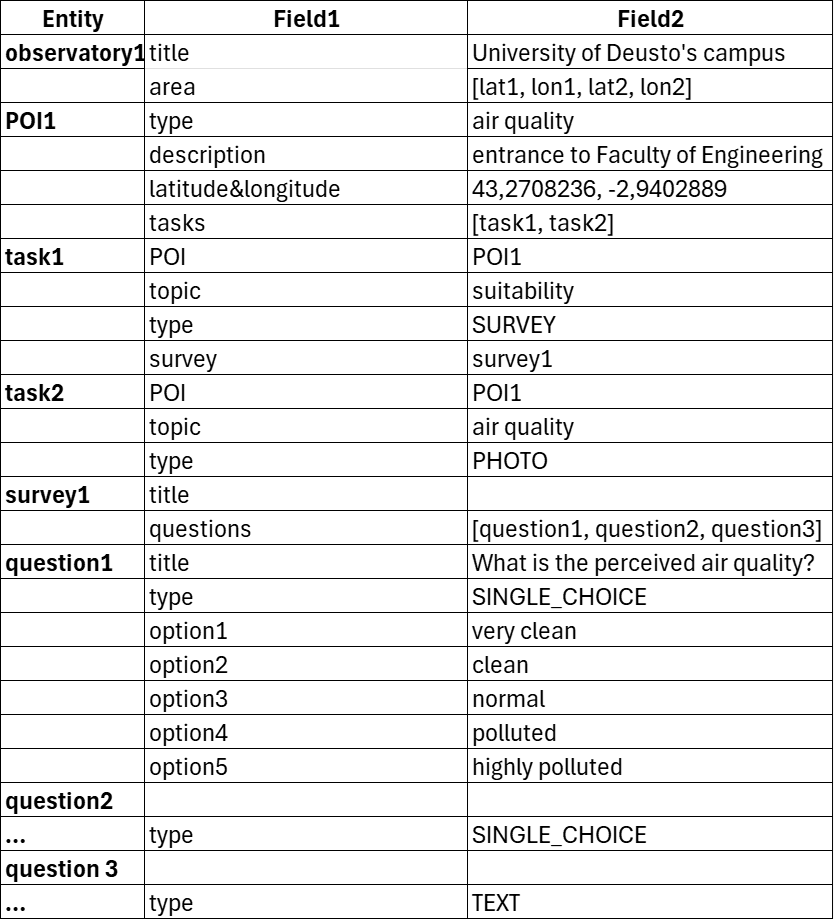- In each POI several tasks can be defined, usually in a campaign the same tasks are required at every measurement point, for each task the following fields are defined: POI associated, topic (e.g. air quality, safety and so on), type (survey, photo, walk and so on), title, description and geocoordinates